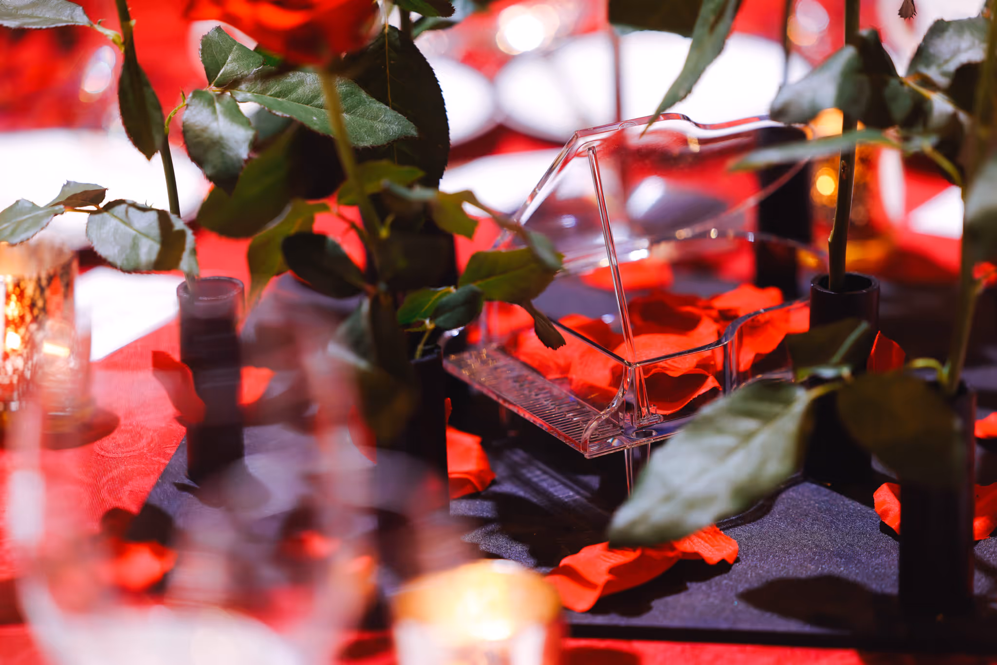 The table flowers were created by Sho Sogabe, a world-renowned flower artist who won the Grand Prix at the 2004 Meridien Cup and represented Japan at the Floralies Internationales Competition in France. Sho Sogabe carefully hand-pasted petals onto a single rose to create a large rose. A delicate scene of petals dancing all over the piano is expressed, and the beauty and transience of YOSHIKI are expressed in the table flowers. In its 10 year history, this will be the first time that decorations from YOSHIKI's dinner shows have been available for sale to the public.